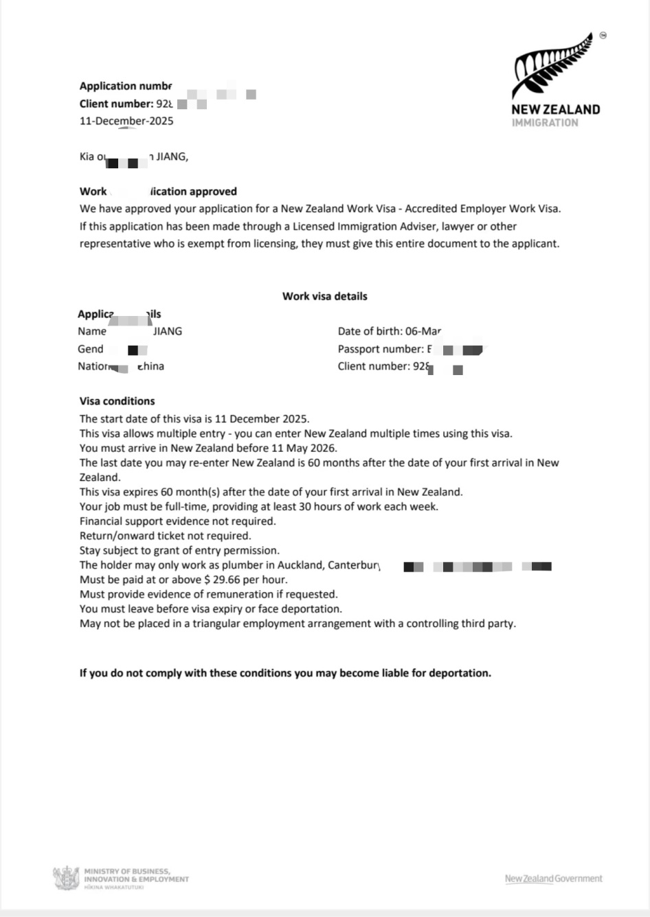刚送走前几天成功获批的新西兰技术工人,今天我们公司又迎来了一个重磅好消息 ——又一位水工师傅的新西兰工作签证顺利下签!短短时间内接连拿下新西兰技工签证,这不仅是客户自身实力的体现,更是我们公司专业服务能力的有力证明!